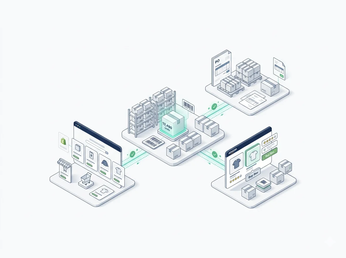 Managing D2C, wholesale, and marketplace inventory separately is how stockouts and oversells happen. Retail Ready consolidates every channel into a single inventory source of truth — so your Shopify store, Amazon listings, and retail POs are always pulling from the same accurate stock count.